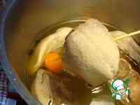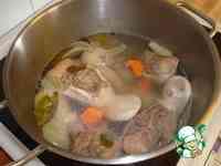 Убавить огонь. Очистить лук и морковь, крупно нарезать и положить в кастрюлю вместе с лавровым листом и горошинами белого и душистого перца. Посолить из
