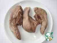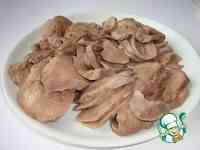 Отмерить 500 граммов языка и нарезать тонкими ломтиками.