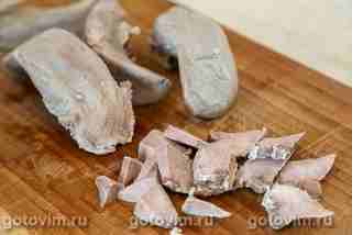Сварить говяжий или свиной язык. Нарезать вареный язык тонкими ломтиками.