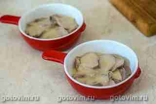 Порционные жаропрочные формочки смазать сливочным маслом. На дно формочек выложить в один слой ломтики вареного языка, полить