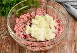 Любой мясной фарш (у меня из говядины и свинины) солим, перчим, дополняем измельченным на крупной терке луком. Хорошо перемешиваем и слегка отбиваем.