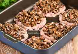 Шампиньоны нарезаем кубиками и обжариваем в масле (2 ст. л.) на сильном огне, помешивая. В конце солим и перчим. Выкладываем на фарш.