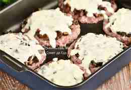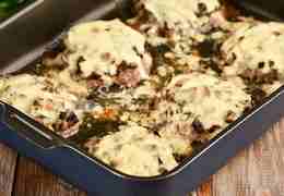 Сверху поливаем горячим соусом. Запекаем в разогретой духовке при 180 градусах 15 минут и еще 10 минут при 200 градусах. Какие еще есть варианты. Вместо фарша отбивные из любого мяса,