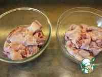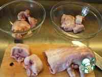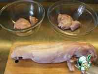 Далее начинаем нарезать кусочки тушки толщиной примерно 3-4 см и также поочерёдно складывать в разные мисочки.
