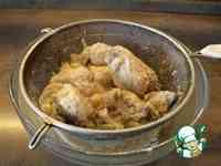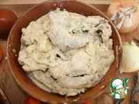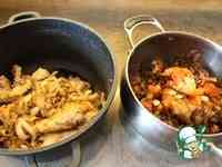заветными кастрюлями... Обжаренный лук выкладываем на наши кусочки крольчатины, каждая сковорода в свою кастрюлю.