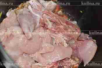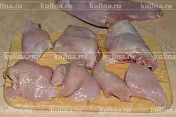 Окорока кролика разрубить на 3 части, мякоть нарезать крупными кусками.