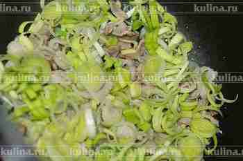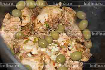 Всыпать оливки, можно добавить для вкуса пару ложек жидкости из-под оливок. Перемешать, жарить 5 минут.