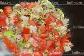 Помидор нарезать и также положить в казан. Обжаривать 2-3 минуты.
