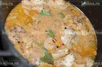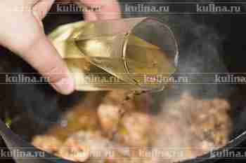 Положить лаврушку и перец, довести почти до кипения, затем температуру уменьшить и томить около 1-1,5 часов на медленном огне.