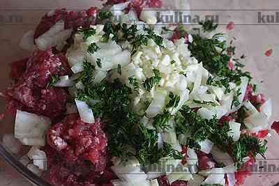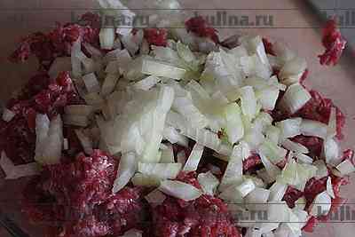 Лук измельчить, выложить вместе с фаршем в миску.
