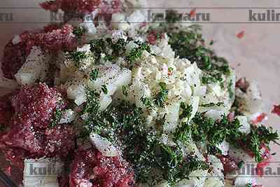 Массу посолить, поперчить, добавить перец, перемешать.