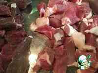 Для начала замаринуем мясо. Нарежем свинину и говядину на кусочки, удобные для прокручивания в вашей мясорубке. Добавим посолочную