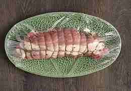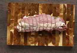 Сверните мясо зеленью внутрь, начиная с короткой стороны, в тугой рулет и обвяжите кулинарным шпагатом с шагом в 4-5 см.