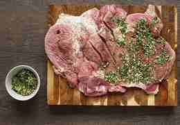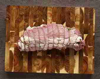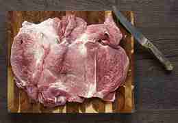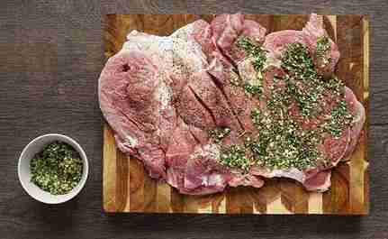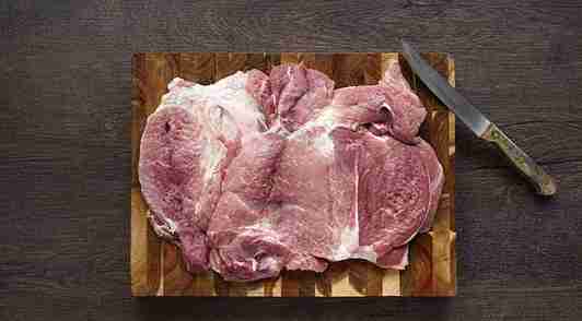 Положите свинину на рабочую поверхность перед собой жирной стороной вниз. Используя длинный острый нож, разрежьте мясо посередине, не прорезая
