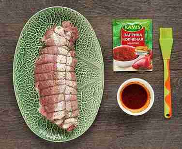 нижнюю треть духовки. Слегка посыпьте рулет солью и перцем. Копченую паприку смешайте с ложкой оливкового масла и смажьте рулет. Поместите поркетту на