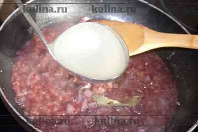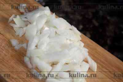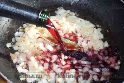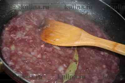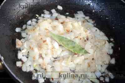 Разогреть в сковороде масло и обжарить лук до мягкости. Выложить лавровый лист.