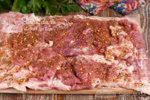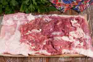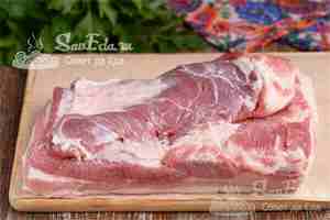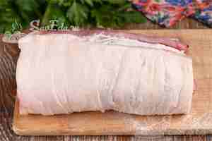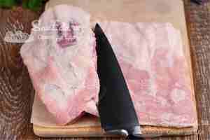 Для приготовления выбираем довольно широкий и мясистый кусок свиной грудинки. Промываем и удаляем кожу.