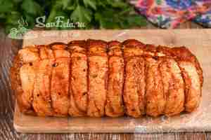 Аккуратно все сворачиваем в рулет. Хорошо, если прослойка сала будет сверху или сбоку. При запекании она защитит рулет от пересыхания.
