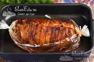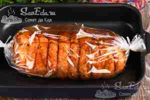 Перекладываем рулет из свинины в рукав для запекания, скрепляем концы и размещаем в форме. Ставим в духовку при 180° C и запекаем 1,5 часа.