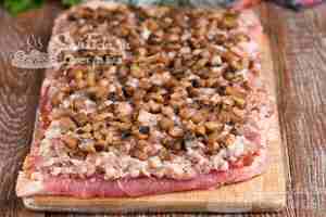 Фарш, у меня домашний из свинины с добавлением лука, специй и соли. Если берем купленный фарш, то все добавляем. Фарш тонким слоем распределяем на мясе.