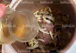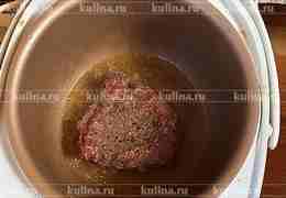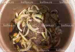 Выложить мясо, перемешать. Переключить мультиварку в режим тушение.