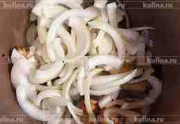 Выложить нарезанный полукольцами репчатый лук.