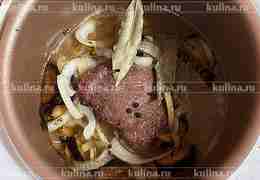 Выложить лавровый лист и горошек. Закрыть мультиварку крышкой, готовить до окончания программы, затем снова включить и готовить еще минут 40.