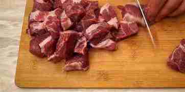 Мясо нарежем кубиками, немного меньше, чем на обычный шашлык. Мясо подойдет любое, свинина, курица, говядина, но вкуснее всего свиная шея.