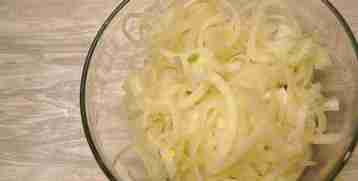 Лук порежем полукольцами, добавим соль и слегка помнем руками.
