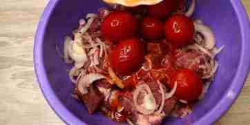 черный молотый перец, затем добавляем лук с солью и перемешиваем. Теперь добавим томаты в собственном соку,