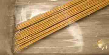 Подготовим деревянные шпажки, зальем их горячей водой и оставим на 15-20 минут. После этой процедуры они