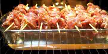 На шпажки нанизываем кусочки мяса. Кладем получившиеся шампуры на подходящий противень, который заменит нам мангал.