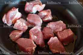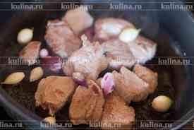 Выложить мясо в сковороду, обжарить до золотистого цвета.