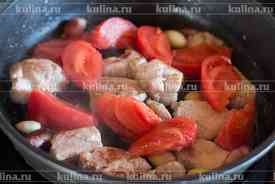 Томат нарезать ломтиками и положить в сковороду.