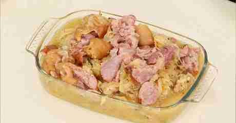 Свиную рульку кладем в кастрюлю, накрываем капустой и тушим все до готовности.