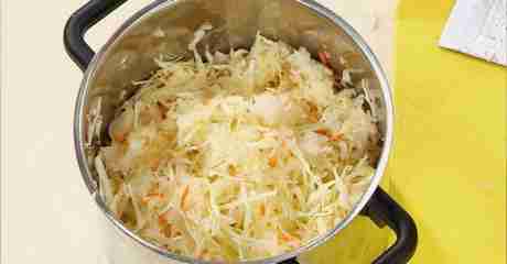 Свежую капусту шинкуем, квашеную промываем водой, отжимаем и нарезаем. Все выкладываем в кастрюлю, добавляем 1 стакан белого сухого вина и 1 стакан
