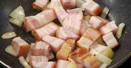 Поочередно нарезаем и обжариваем с небольшим количеством лука варено-копченую грудинку и сырокопченый бекон, выкладываем в