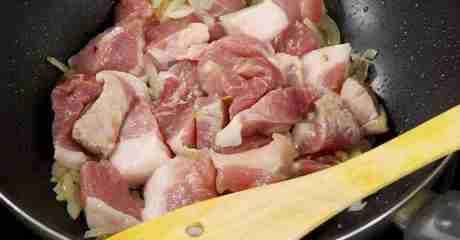 Лук и чеснок нарезаем и обжариваем в растительном масле. Добавляем нарезанную на средние кусочки свинину, обжариваем, солим, перчим и