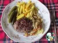 Подаем горячие бифштексы с луком, по традиции с жареной картошкой, в идеале - фри, и маринованным огурчиком.
