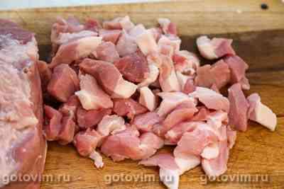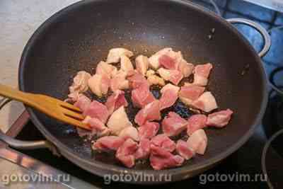 В сковороде разогреть немного растительного масла и небольшими порциями обжаривать до золотистой корочки кусочки свинины. Следом