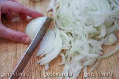 Лук очистить, каждую луковицу разрезать пополам и порубить полукольцами толщиной около 5 мм. Чеснок очистить и мелко порубить.