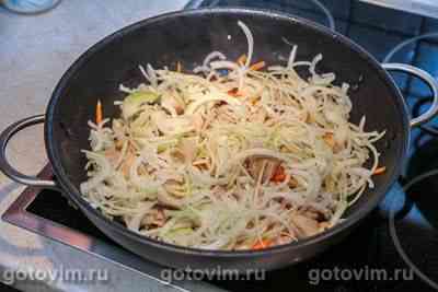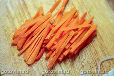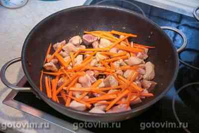 Когда мясо будет обжарено, добавить в сковороду морковь. Перемешать и быстро обжарить.