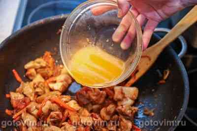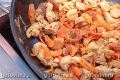 Влить мандариновый сок, уменьшить огонь и томить мясо с овощами и курагой под крышкой примерно 20 минут. Готовую жареную свинину с