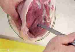 Шпигуем рульку: дольки чеснока разрезаем вдоль пополам и обваливаем в соли. Прокалываем свинину тонким ножом и вставляем в отверстие чеснок.