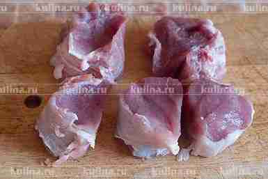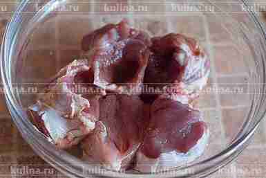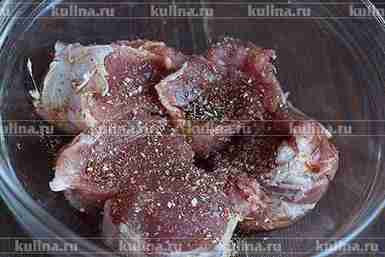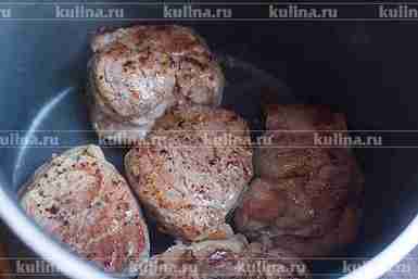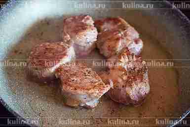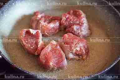 В сковороде разогреть растительное масло, выложить куски мяса. Обжарить с одной стороны до золотистого цвета.