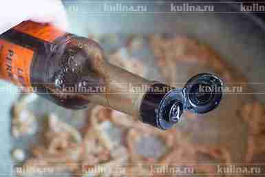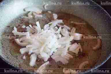 Репчатый лук нарезать соломкой и положить в сковороду, где обжаривалось мясо.