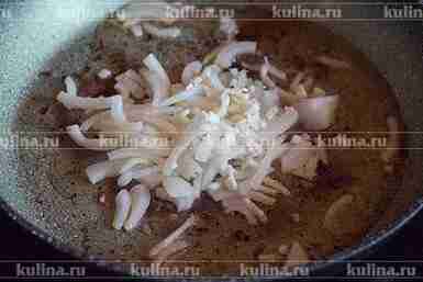 Чеснок измельчить и положить к луку. Слегка обжарить.