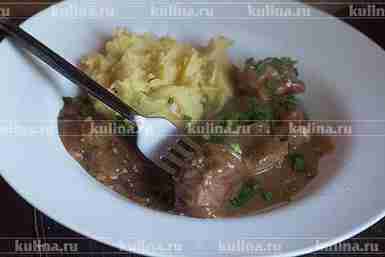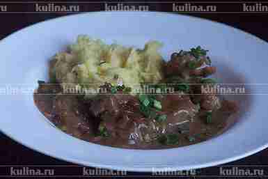 Разложить свинину по тарелкам. В качестве гарнира приготовить картофельное пюре. Посыпать блюдо мелко нарезанным зеленым луком.