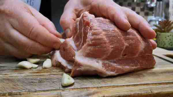 проколы острым тонким ножом и нашпиговываем мясо чесноком. Толстые крупные
