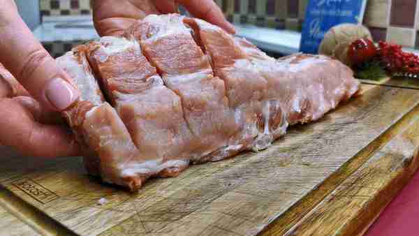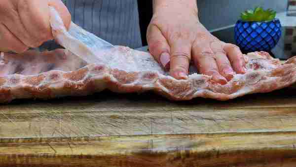 Берем свиные ребрышки, как всегда, промываем, просушиваем полотенцем и снимаем пленки.